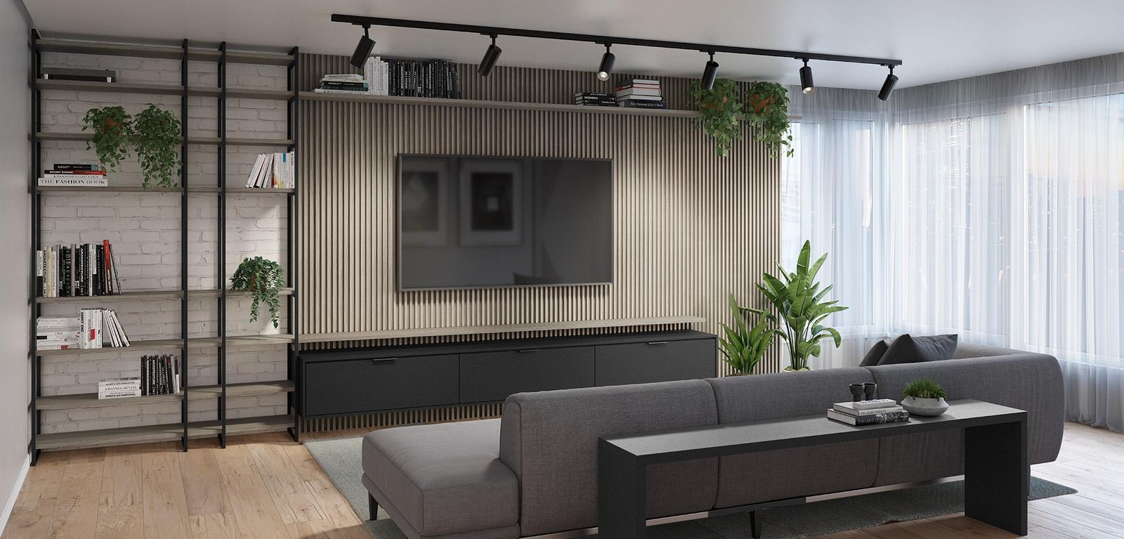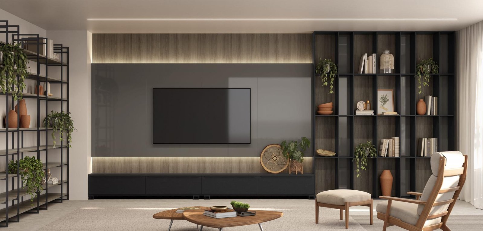 A sala de estar inspira modernidade e unicidade. As cores em tons fazem um contraste harmonioso com o painel ripado.