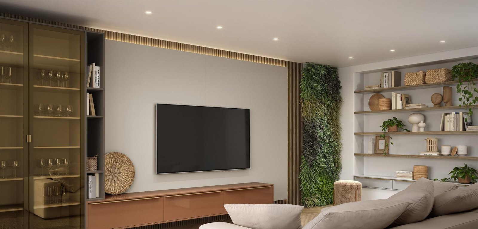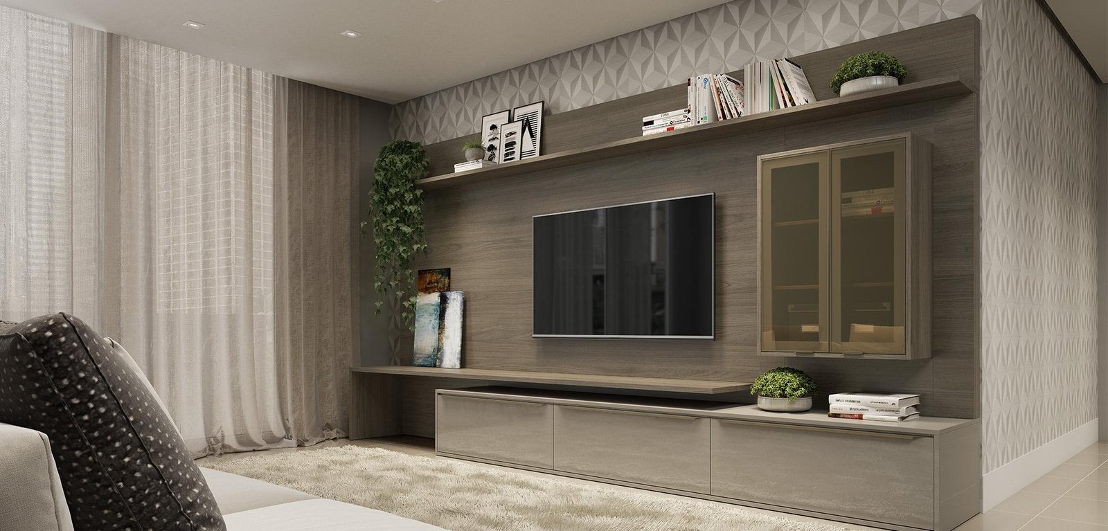 Os tons clássicos e neutros desta sala de estar a transformam em um ambiente acolhedor e cheio de estilo. O detalhe em vidro torna o espaço ainda mais único.